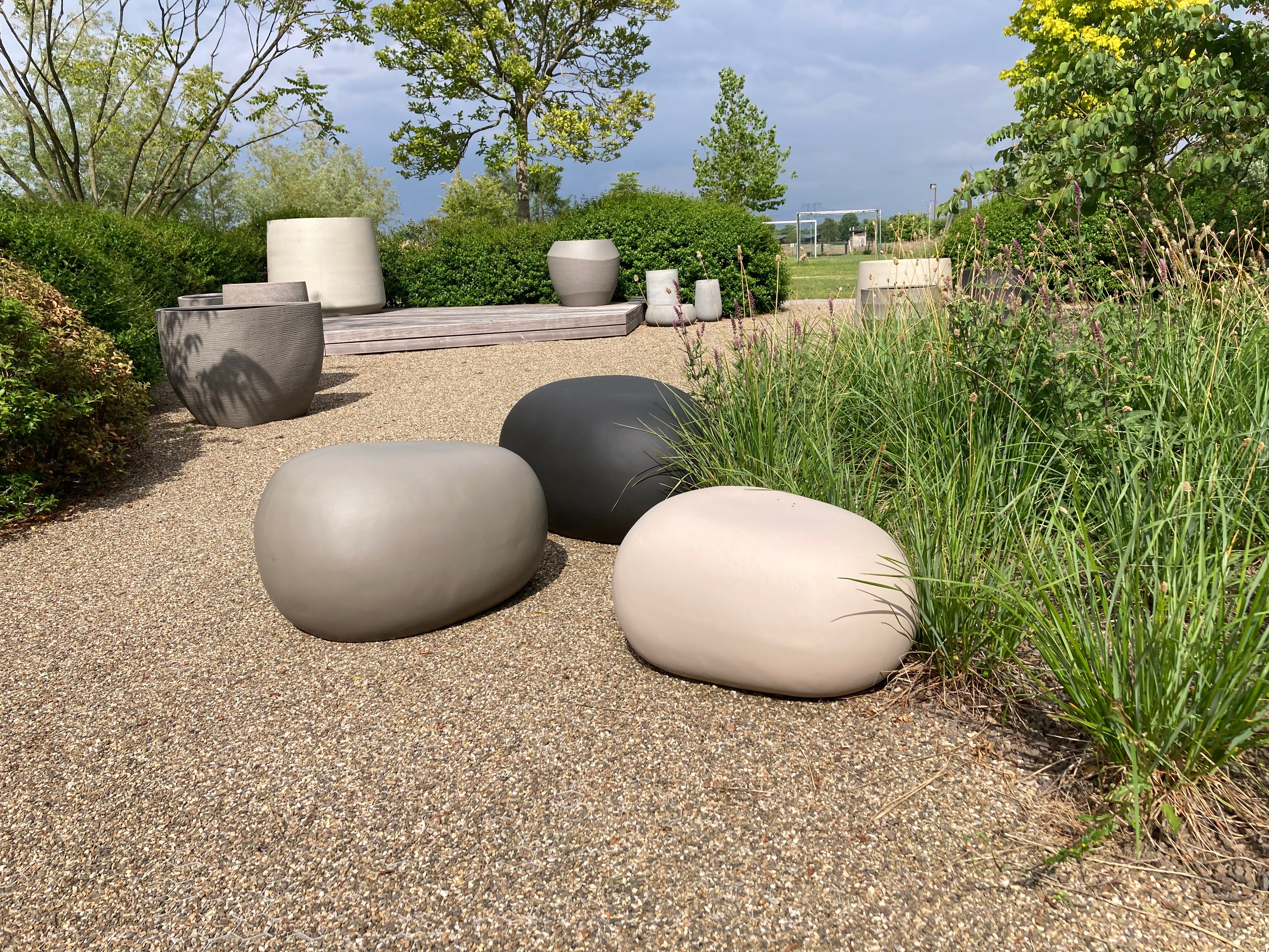 Geïnspireerd op de vorm van natuurkeien, maar verrassend licht en extreem duurzaam. Ideaal als comfortabele zitplek of sculpturale eyecatcher.